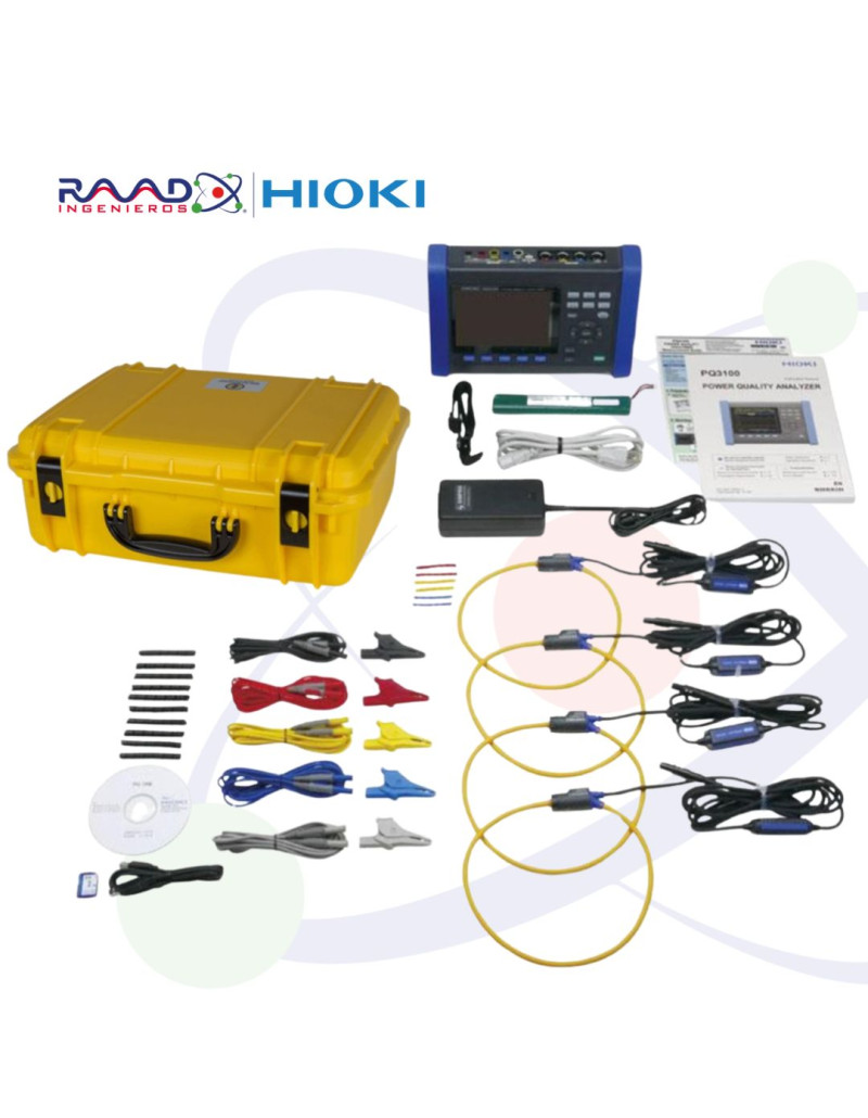 Accesorios incluidos: Manual de instrucciones ×1, Guía de medición ×1, Cable de voltaje L1000-05 ×1 juego (rojo/amarillo/azul/gris/negro, pinza de cocodrilo ×5, tubo espiral ×5), Clip de color (para identificar el color del sensor de la pinza) ×1 juego, Tubo espiral ×5, Adaptador de CA Z1002 ×1, Correa ×1, Cable USB (1 m 3,28 ft de longitud) ×1, Paquete de batería Z1003 ×1, PQ ONE (software, CD) ×1