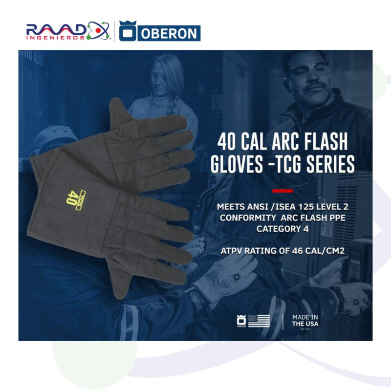 Guantes Arc Flash TCG™ calibre 40 de OBERON cumple con la norma ANSI/ISEA 125 Nivel 2 y la categoría 4 de EPP contra arco eléctrico, con una clasificación de arco de 46 cal/cm². Consulte las normas NFPA 70E o CSA Z462 para conocer los requisitos de selección específicos.