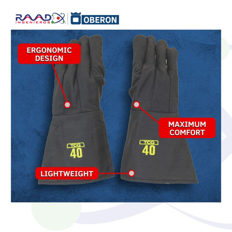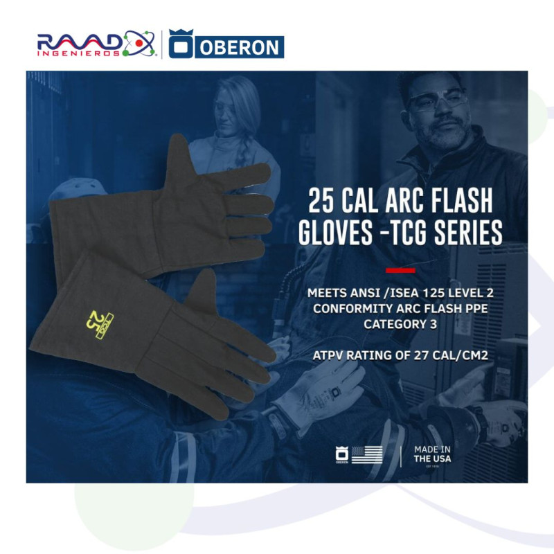 Guantes Arc Flash TCG™ calibre 25 de OBERON cumplen con la norma ANSI/ISEA 125 Nivel 2 y la categoría 3 de EPP contra arco eléctrico, con una clasificación de arco de 27 cal/cm². Consulte las normas NFPA 70E o CSA Z462 para conocer los requisitos de selección específicos.