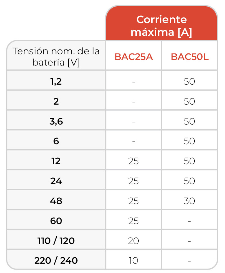 En la tabla siguiente encontrará una visión de conjunto de las corrientes máximas de carga de los modelos BAC25A y BAC50L para varios niveles de tensión de batería.