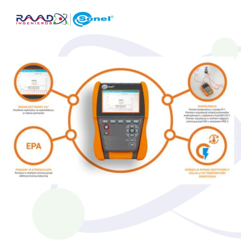 El equipo se puede usar para medir la resistencia de aislamiento usando la prueba de tensión hasta 2500 V. Al probar los cables, des descargan automáticamente al momento de completar la medición. Junto con PRZ-2 (el juego para medir resistencia en áreas protegidas de ESD) es una herramienta integral para los coordinadores que se ocupan de la protección de las plantas contra la electricidad estática.