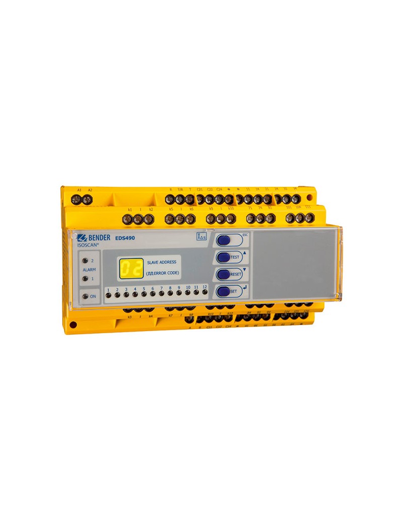 BENDER, El módulo de localización de falla a tierra en combinación con el  detector de falla a tierra IRDH575 o de un aparato de prueba de fallos de aislamiento PGH, localiza fallas  en derivados  de sistemas no aterrizados de CA /CD. Por cada EDS490/491 se pueden monitorear hasta 12 circuitos derivados. Se pueden conectar a través de un interfaz RS-485 (Protocolo BMS), hasta un máximo de 90 aparatos de evaluación EDS y de este modo se pueden vigilar hasta 1080 salidas.  El ISOSCAN EDS460 trabaja en ambos sistemas de CA y CD, incluyendo sistemas con variadores de frecuencia. Una pantalla LCD muestra cual derivado presenta la falla a tierra tan pronto como la falla es localizada.