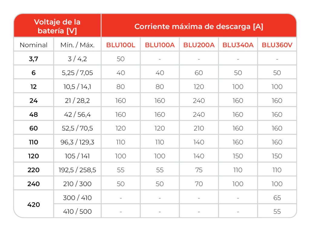 En la tabla siguiente encontrará una visión de conjunto de las corrientes máximas de descarga de los modelos BLU-A para varios niveles de tensión de batería.