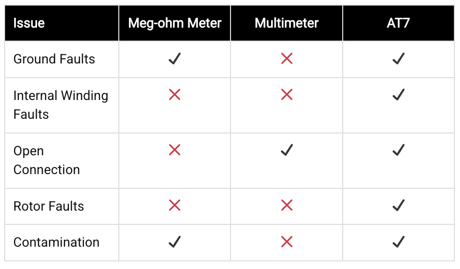 Mientras que otras herramientas similares de monitorización de estado y resolución de problemas del motor solo son capaces de detectar fallos a tierra, el AT7™ tiene la capacidad de detectar fallos del motor antes de que se produzcan y es un componente crítico para mantener la productividad de una instalación y el ROI general.