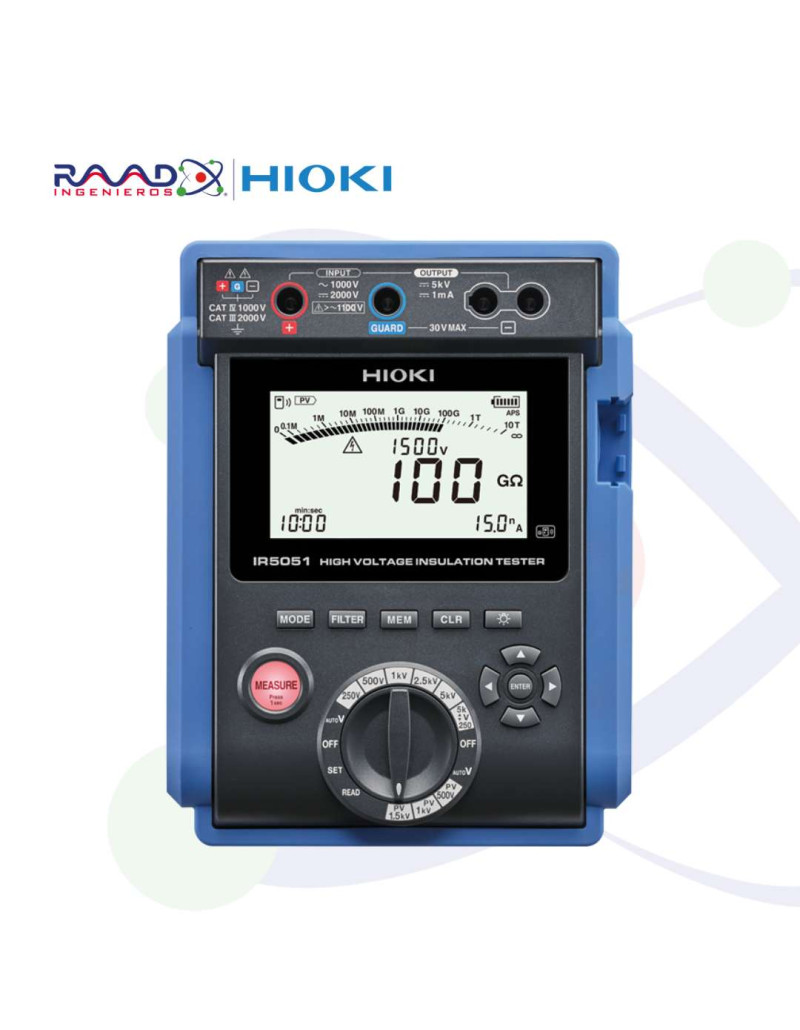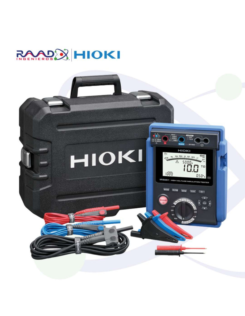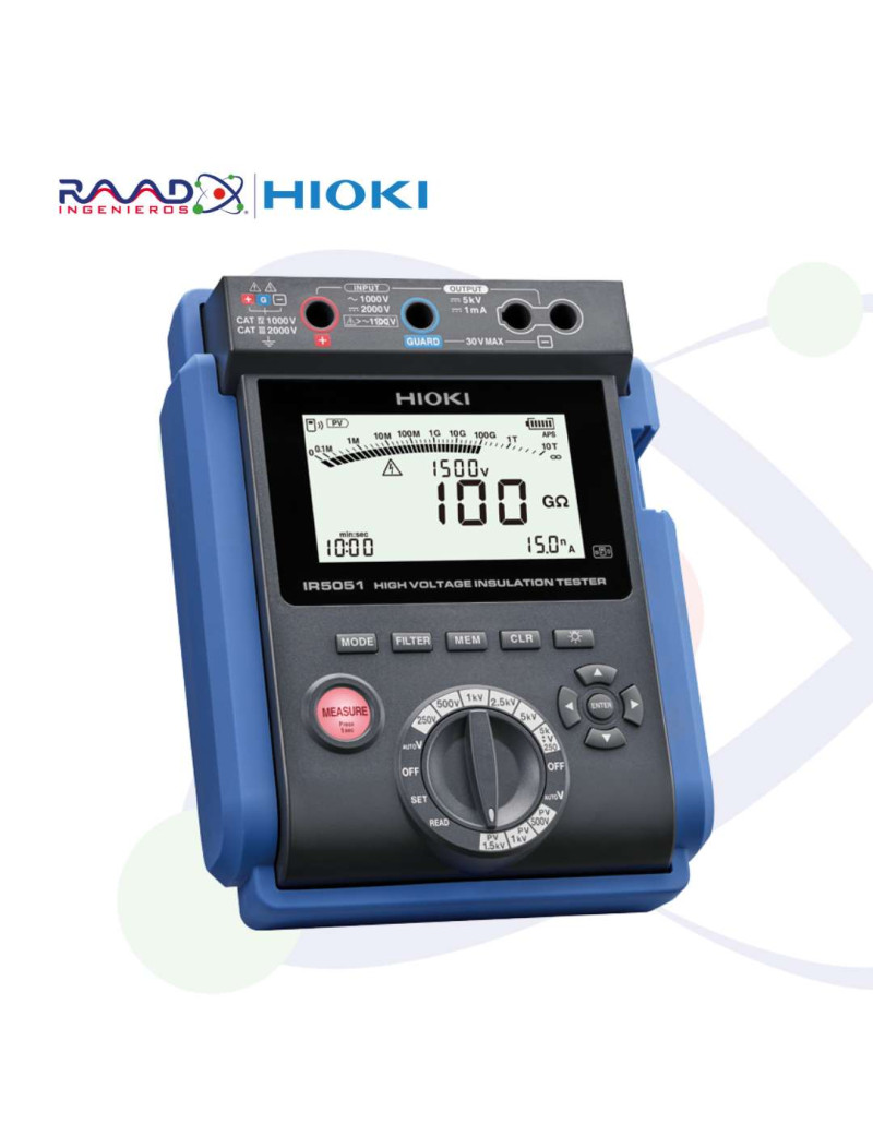 El IR5051 es un probador de resistencia de aislamiento de alto voltaje, compacto y liviano capaz de generar hasta 5 kV. Su tecnología de medición única permite mediciones estables de hasta 10 TΩ. Además, el IR5051 es capaz de probar la resistencia de aislamiento de los sistemas solares fotovoltaicos durante la generación de energía y tiene una clasificación de seguridad CAT III de 2000 V para permitir pruebas de sistemas fotovoltaicos de 2000 V.